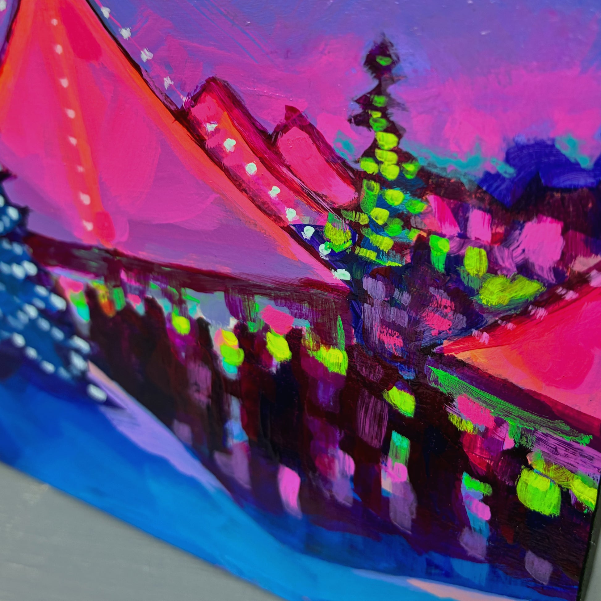 Il s’agit d’une peinture à l’huile originale de 16" x 16". Il est verni sur un panneau de bois bercé de 1" de profondeur. Côtés peints en noir pour que vous puissiez l'accrocher avec ou sans cadre.