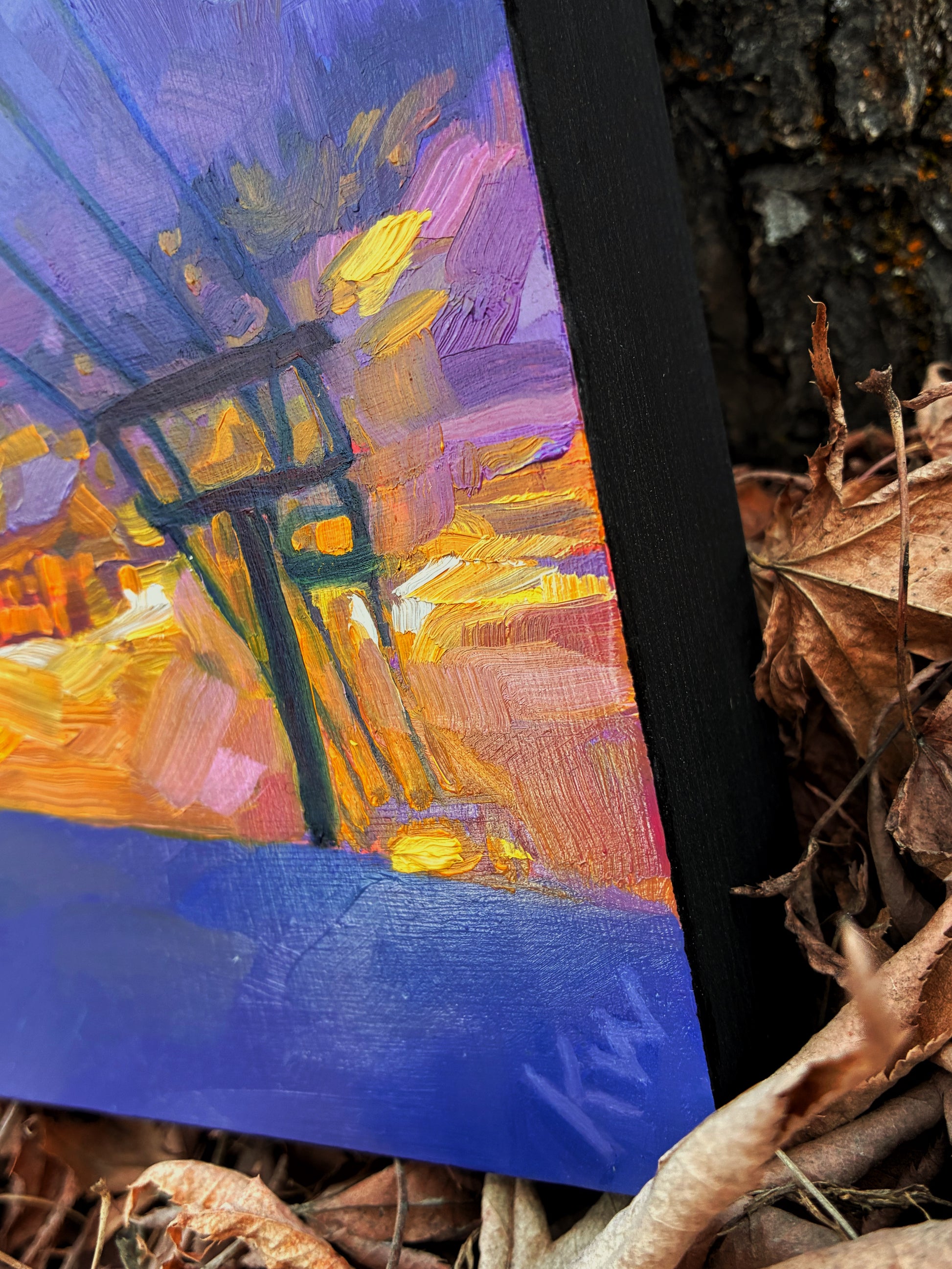 This is an 8" x 8" original oil painting. It is varnished on a 1.25" deep cradled wood panel. Sides painted black so you can hang it framed or unframed.